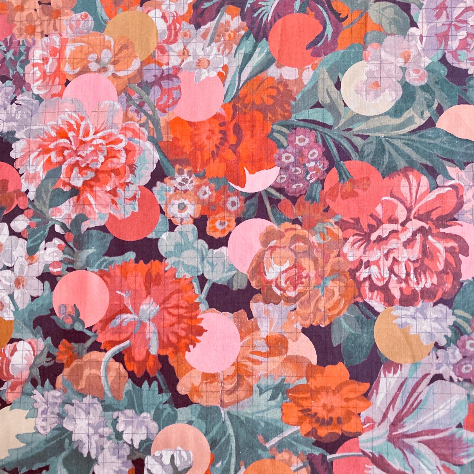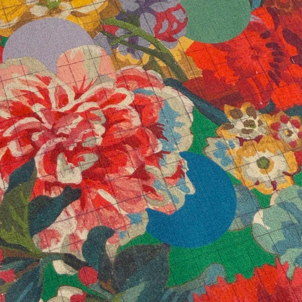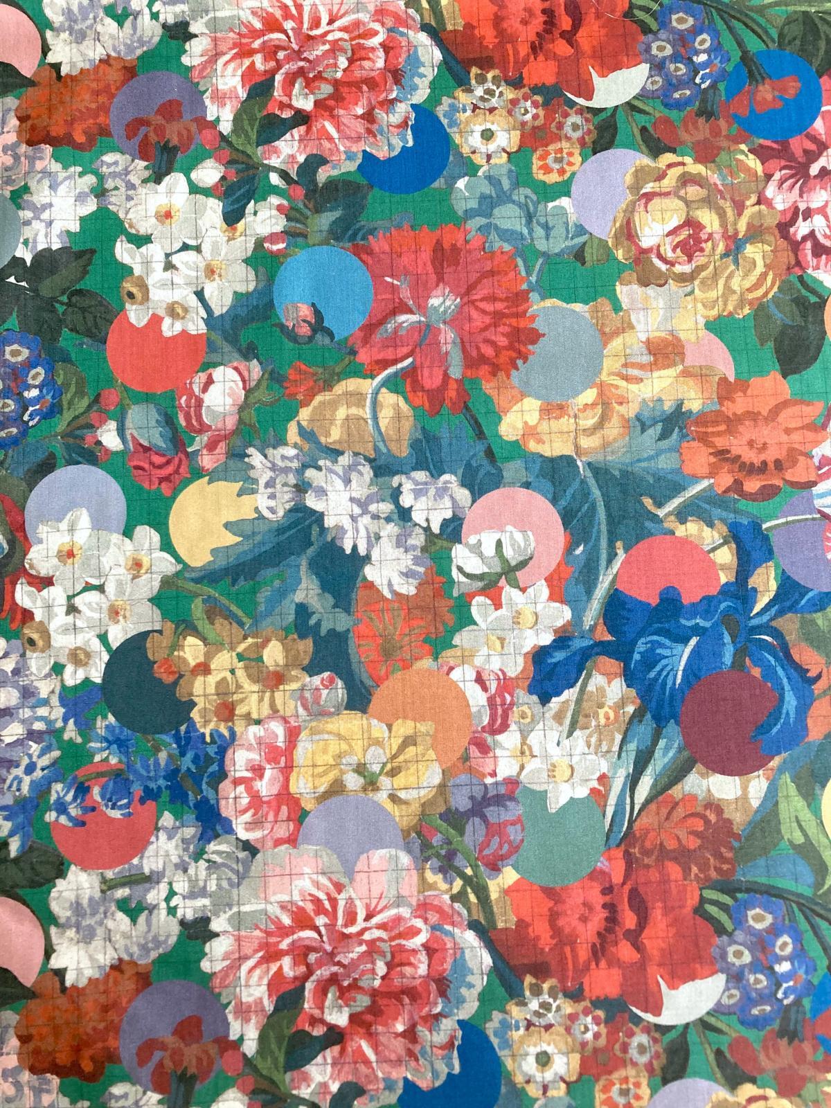 Amid a lush arrangement of tulips, roses, primroses, carnations, daffodils, and irises in full bloom, a subtle check pattern emerges, while vibrant polka dots act as guides, defining the boundaries between colors.
