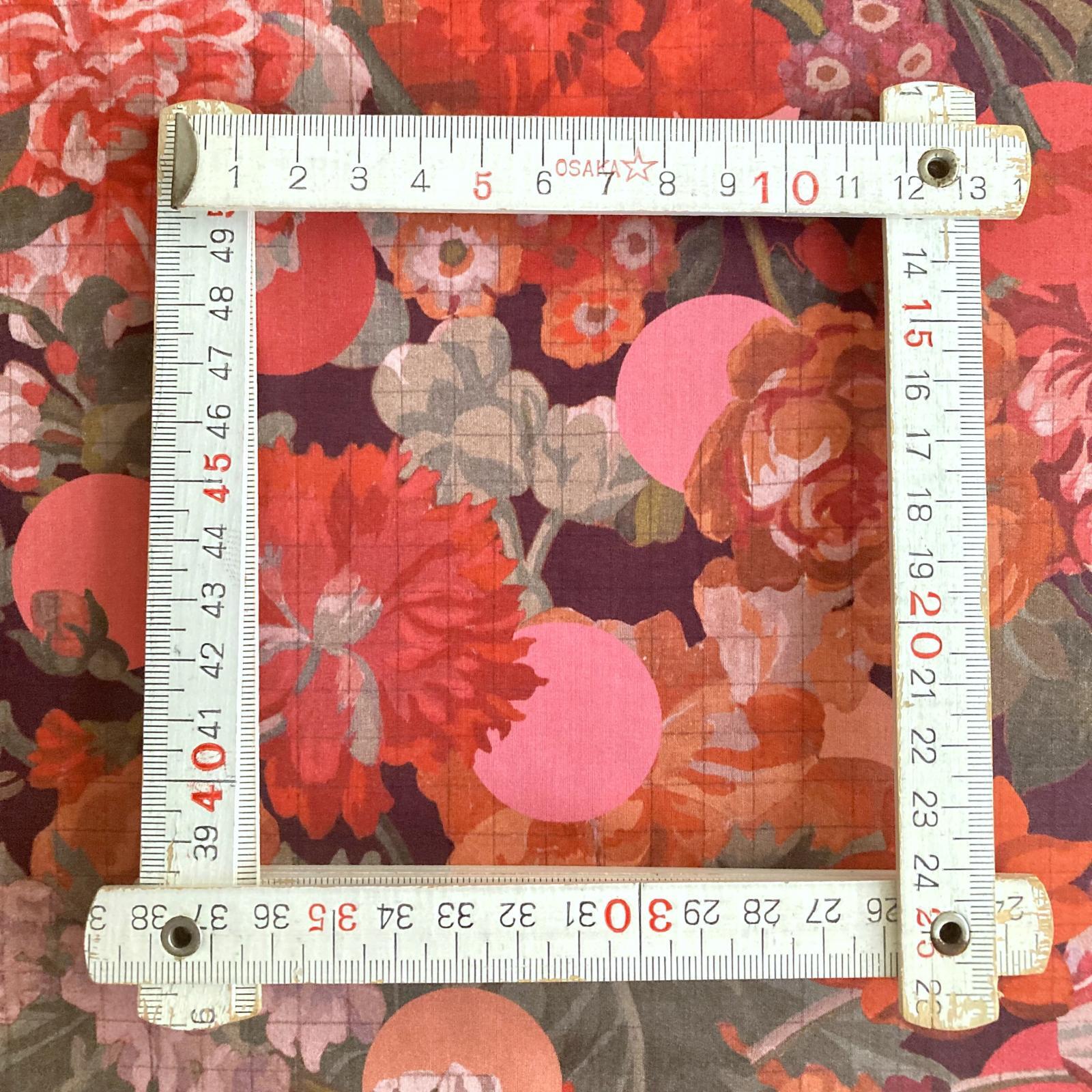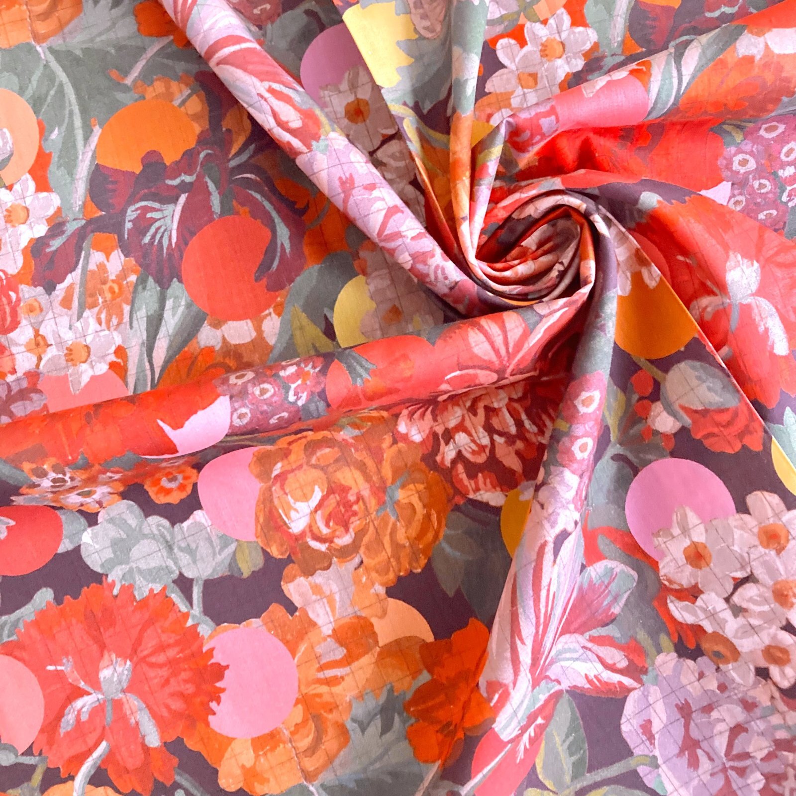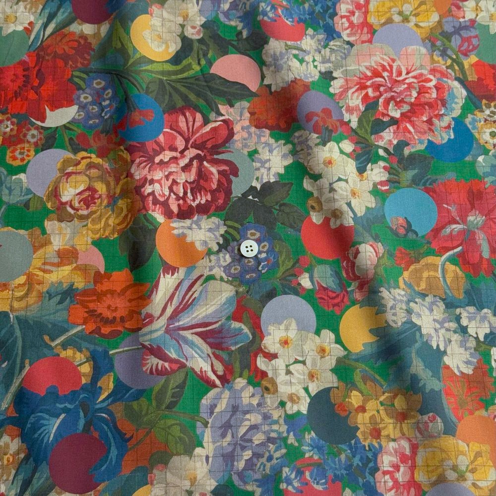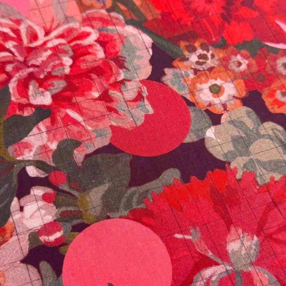 Amid a lush arrangement of tulips, roses, primroses, carnations, daffodils, and irises in full bloom, a subtle check pattern emerges, while vibrant polka dots act as guides, defining the boundaries between colors.