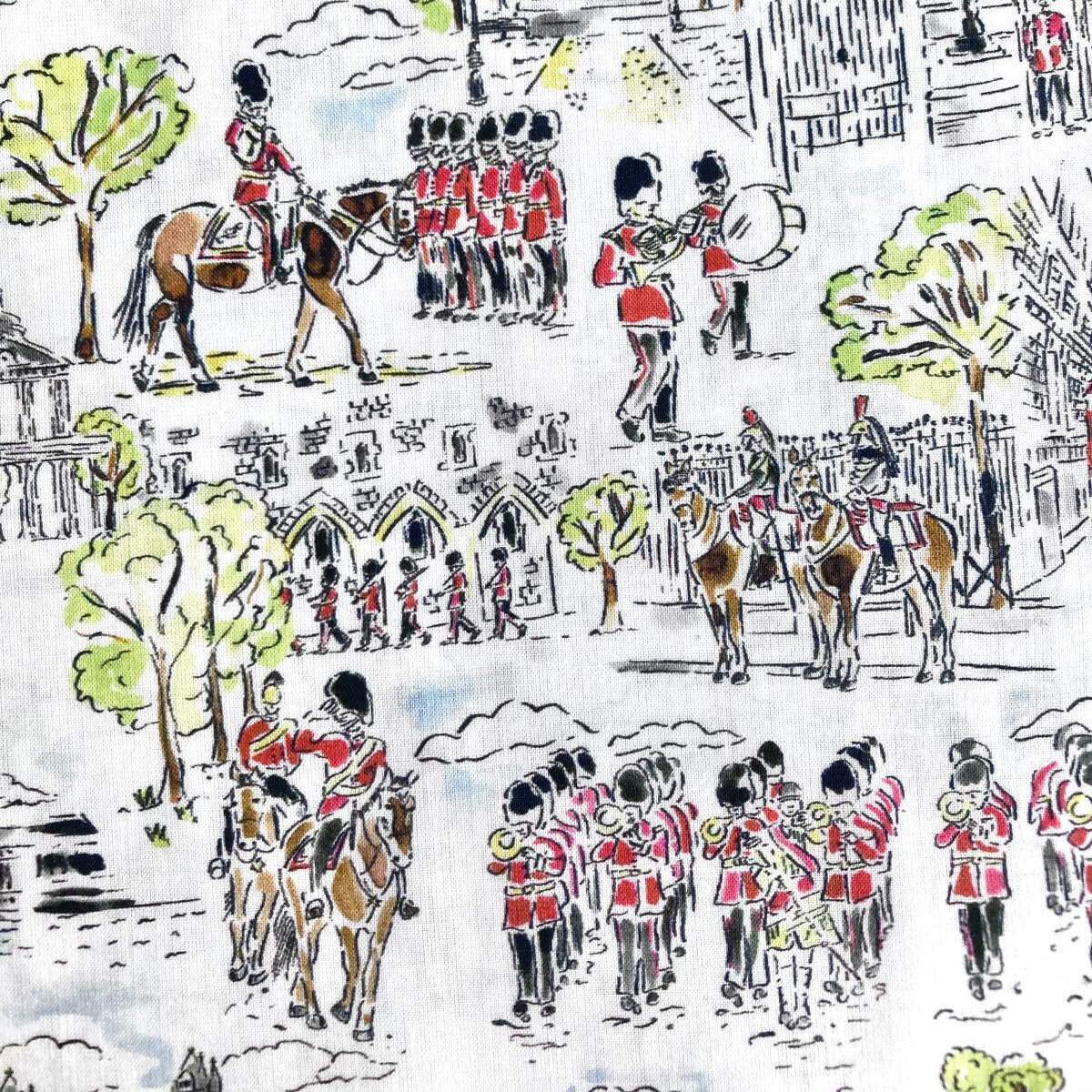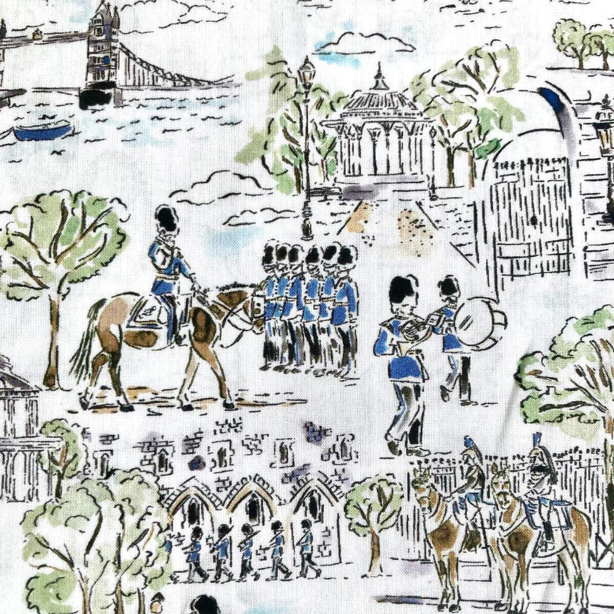 This design captures a quintessentially British London scene, depicting marching bands and mounted guards parading against the backdrop of iconic London landmarks.
