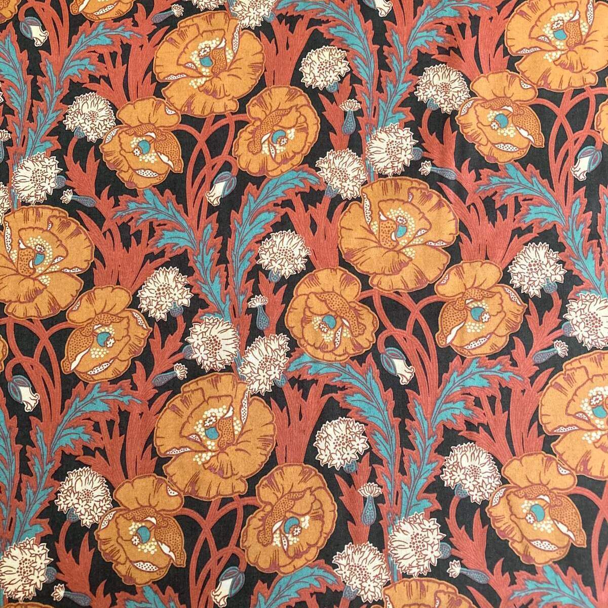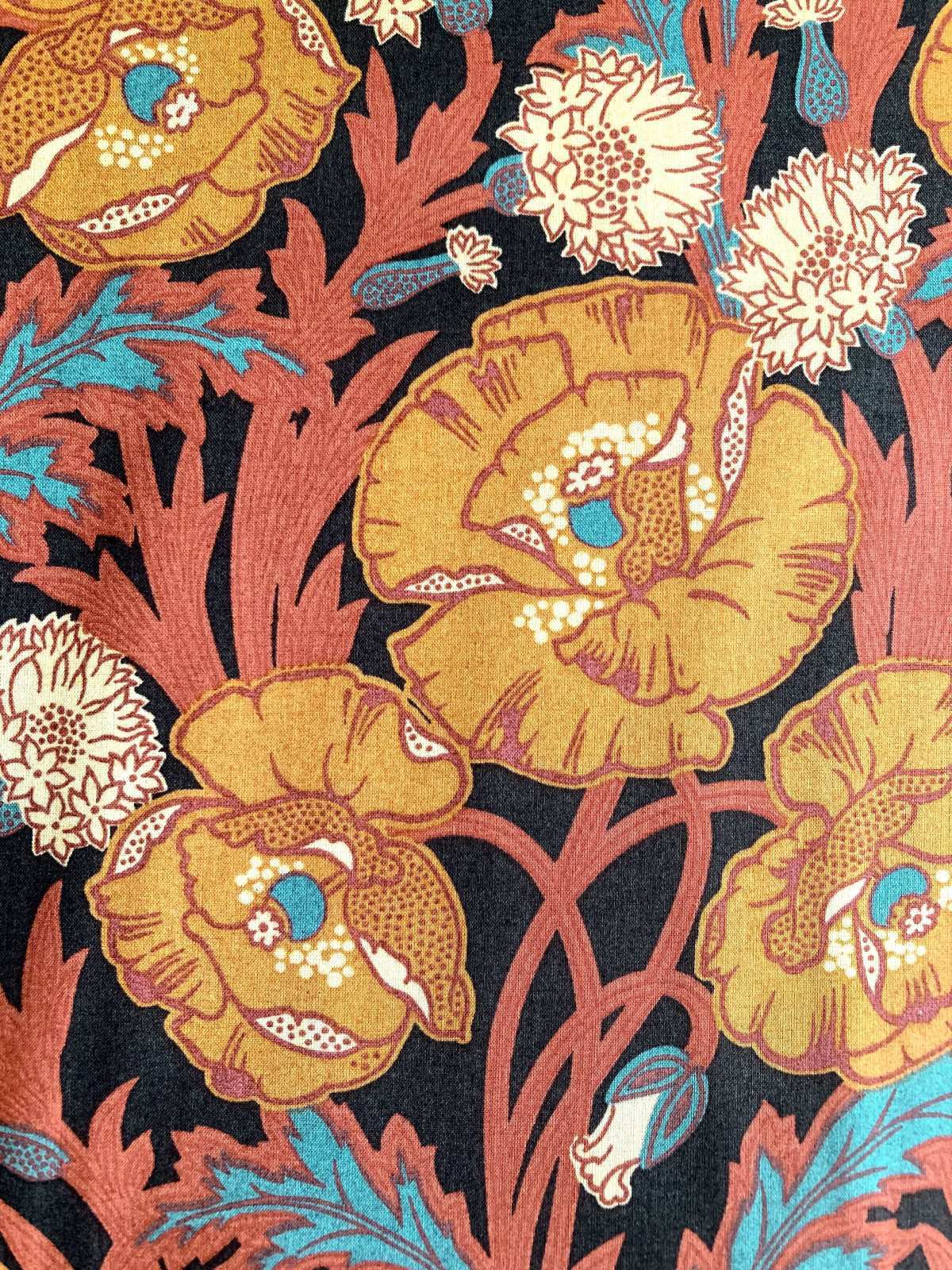 Maud’s Posy is a tribute to one of Liberty’s signature flowers- the iconic poppy. Hand-painted in the early 1980s, this sophisticated botanical is a contemporary rendition of a typical Art Nouveau design. Elegant trailing poppies, winding foliage and pops of stylised carnations are emphasised by richly coloured grounds and bold outlines.